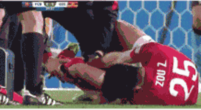 上半时第34分钟,邹正在自家禁区内与阿尔维斯抢位置,慢镜头显示,马斯切拉诺长传将皮球吊入禁区,阿尔维斯前插和邹正形成了争顶态势,但在阿尔维斯的推搡下,邹正没能把握重心,结果脚一滑,脚尖先着地,然后整个身体的重量压在右腿上,造成膝盖严重扭伤,整个小腿变形,恐怖不已。